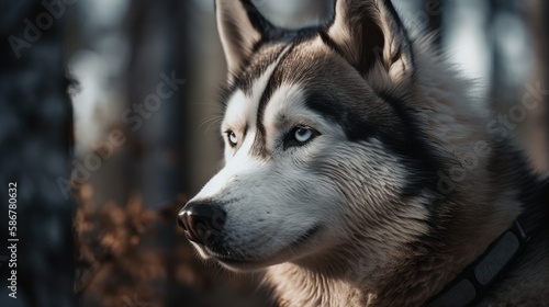 Portrait of a Siberian Husky dog in the winter forest.Generative Ai