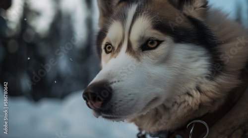 Portrait of a Siberian Husky dog in the winter forest.Generative Ai