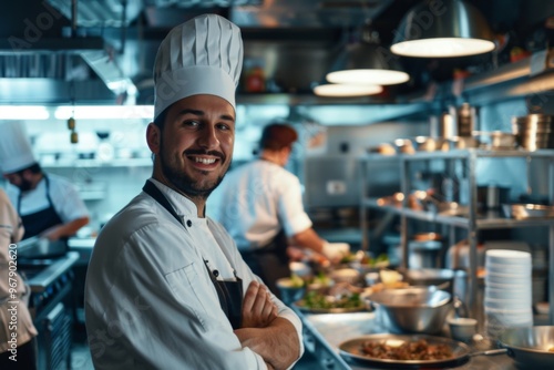 people, portrait, smiling, american, chef, commercial, kitchen, man, male, professional, cook, culinary, eatery, uniform, caucasian, white, cooking, indoor, food, work, occupation, hospitality, business, culinary arts, happy, joyful, confidence, expertise, food preparation, kitchen equipment, service, apron, career, teamwork, skilful, focused, lifestyle, copy space
