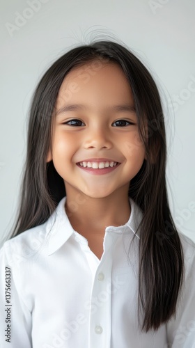 girl, children, asian, asian girl, portrait, smiling, happy, cheerful, children, young, beautiful, cute, pretty, innocent, expression, face, emotion, positive, joyful, healthy, white shirt, collar, long hair, black hair, studio shot, head shot, white background, clean, neat, tidy, confident, schoolgirl, elementary school, elementary school, childhood, youth, carefree
