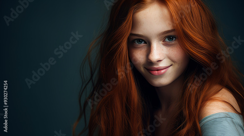 Portrait of a smiling cheerful teenage girl with long red hair and perfect skin, dark blue background, banner.