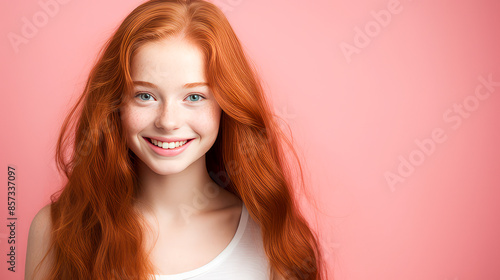 Portrait of a smiling cheerful teenage girl with long red hair and perfect skin, pink background, banner.