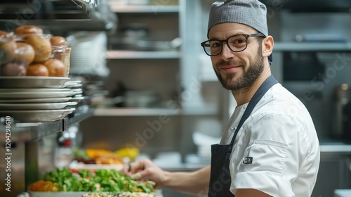 chef, cook, kitchen, smiling, food, cooking, standing, professional, occupation, cookery, job, profession, hand, man, smile, photogenic, service, men at work, work, 1