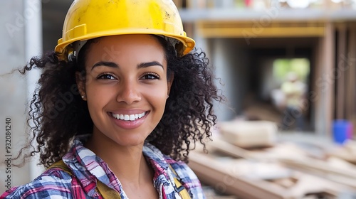 Portrait of a smiling female construction worker wearing a yellow hard hat and plaid shirt, standing confidently on an active construction site.