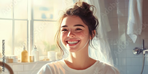 Portrait of a smiling female in a bathroom, showcasing natural beauty and joy. This portrait captures the essence of a cheerful woman in a modern bathroom setting.