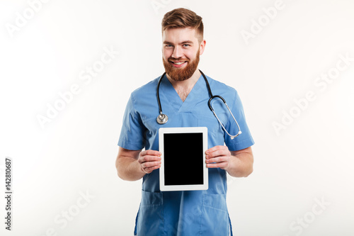 young, white, man, medicals, isolated, doctor, computer, technology, people, health, adult, background, care, male, tablet, screen, portable, touch screen, specialist, stethoscope, uniform, working, professional, practitioner, pad, wireless, equipment, hospital, electronic, digital, display, blank, happy, notebook, medicine, looking, 1, positive, modern, holding, friendly, device, attractive, caucasian, showing, presenting, information, diagnosis, smiling