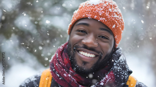 Portrait of a smiling, happy, and cheerful African American man, a joyful and positive guy, dressed in winter clothing, enjoying the snowfall outdoors in nature during the cold season, tourism