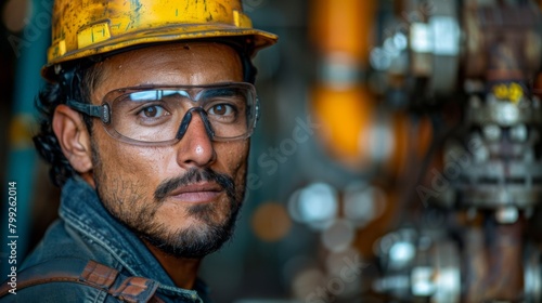 Portrait of a smiling hispanic worker wearing a hard hat and safety glasses standing in a factory,Smiling Hispanic Worker in Factory: Skilled Labor and Manufacturing Industry
