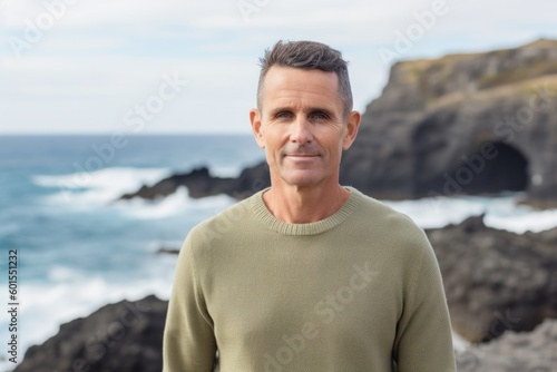 portrait, lifestyle, photo, pleased, emotion, expression, male, adult, 40s, man, plush, outfit, fall, soft, wool, sweater, top, snug, comfort, pullover, knitted, cosy, wearing, fashion, layer, coastline, travel, ocean, sand, tropical, background, wave, relaxation, sea, vacation