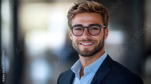man, portrait, face, smile, happy, goggles, eyewear, suit, jacket, shirt, collar, blue, white, teeth, eye, green, skin, beard, stubble field, hair, blond, background, blurred, professional, confident, business, photogenic, model, fashion, style, person, male, expression, indoor, closeup, casual attire