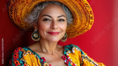 Portrait of a Smiling Mature Woman Wearing a Vibrant Yellow Hat and Embroidered Dress Against a Red