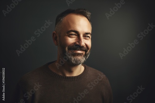 Portrait of a smiling middle-aged man in a brown sweater on a dark background