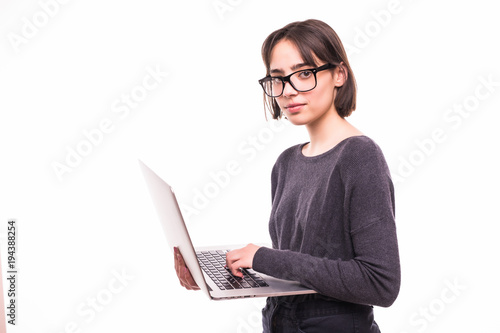 Portrait of a smiling teen girl holding laptop computer isolated on a white background