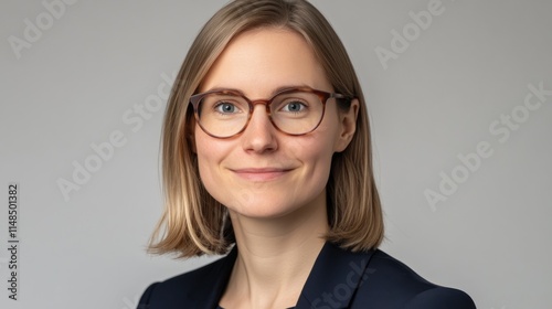 woman, female, portrait, goggles, smiling, happy, face, head shot, shoulder, blond, hair, eye, blue, brown, tortoiseshell, spectacle, eyewear, professional, business, corporate, suit, jacket, clothing, attire, style, fashion, expression, confident, cheerful, friendly, optimistic, calm, serene, neutral, background, grey, studio, light, photo, image, picture, person