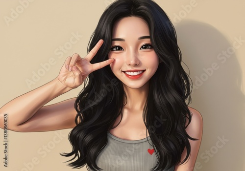 portrait, woman, smile, hair, peace, signs, background, eye, lip, face, arm, hand, shoulder, skin, expression, style, beauty, pose, artwork, illustration, design, image, girl, youth, nubes, tank, top, casual attire, indoor, digital