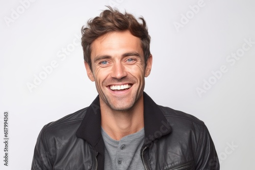 Portrait of a smiling young man in leather jacket on white background