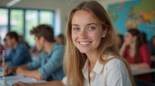 Portrait of a student in the classroom pupil at school pretty student close up