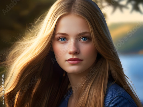 Portrait of a teenage girl or young woman with blue eyes and blonde hair.