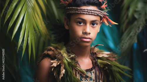 Portrait of a teenage male from the Yap culture in Micronesia. Man in traditional thuwa loincloth made from hibiscus fibers, contrasting with the turquoise lagoon.
