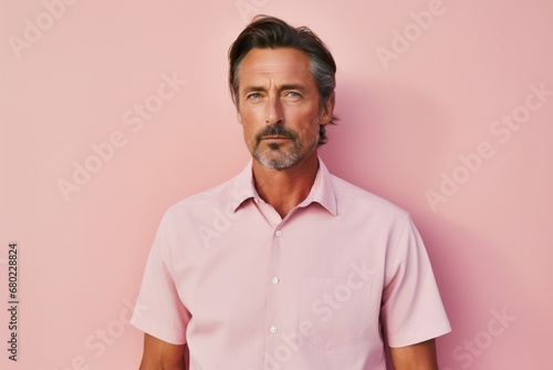 Portrait of a tender man in his 40s sporting a technical climbing shirt against a solid pastel color wall. AI Generation
