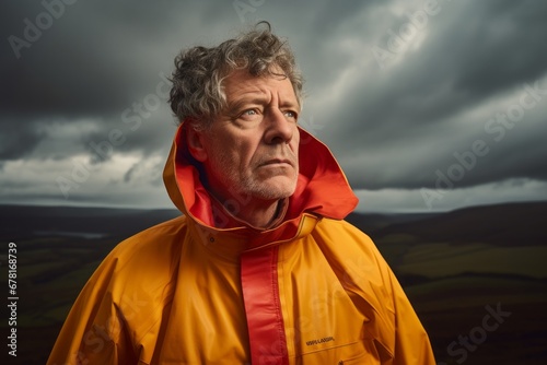 Portrait of a tender man in his 50s wearing a vibrant raincoat against a quiet countryside landscape. AI Generation