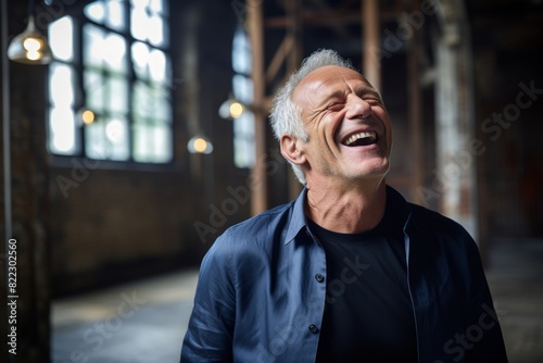 Portrait of a tender man in his 60s laughing in front of empty modern loft background