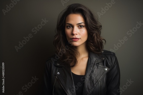 Portrait of a tender woman in her 30s sporting a classic leather jacket against a plain cyclorama studio wall. AI Generation
