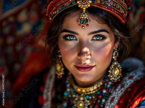 turkmen, turkmenistan, asia, middle east, east, woman, fashion, beauty, face, dress, lady, model, make-up, hair, costume, traditional, red, eye, dancer, bride, people, glamour, person, style, make-up, ethnic, black, india, gold, smile
