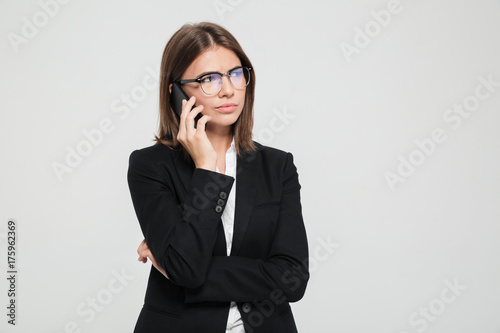 Portrait of a unsatisfied confused businesswoman in eyeglasses and suit