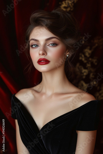 beauty, elegance, glamour, confidence, grace, charme, style, smile, eye, fashion, femininity, radiance, allure, make-up, coiffure, youth, poise, expression, aesthetic, woman, hair, model, face, make-up, person, dark, dress, lady, black, lip, brunette, sensual, 1, red, posing, sensuality