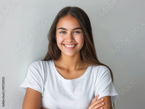 woman, beauty, smile, smiling, brunette, face, model, person, people, happiness, hair, 1, fashion, lady, looking, casual attire, studio, cute, teenage, cheerful, joy