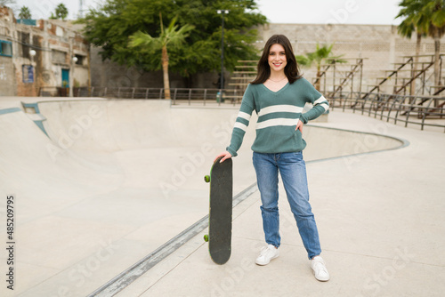 woman, 20s, caucasian, young adult, adult, skate, sk8, skateboard, park, skateboarding, casual attire, relax, centennial, hanging out, smile, smiling, happy, happiness, resting, playing, fun, people, lifestyle, beautiful, attractive, cheerful, enjoying, portrait, eye contact, full-length