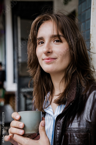 woman, enjoying, hot drink, outdoors, casual attire, style, 1, smiling, copy space, people, taking, break, modern, drink, leather, jacket, young, adult, closeup, refreshment, striped, shirt, teenage, morning, female, caucasian, confidence, road, cup, lifestyle, leisure, drinking, brown hair, enjoyment, energy