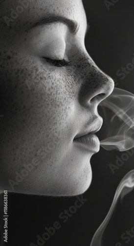 woman, smoke, portrait, serene, freckle, emanating, calm, lighting, expression, beauty, texture, calmness, profile, soft, moment, inhalation, relaxation, art, aesthetic, closeup, depth, monochrome, emotion, sharpened, intimate, stillness, visual, atmosphere, elegance, breath, artistry, detail, human, character, face, silhouette, mystique, sensitivity, nature, charme, gaze