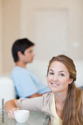 attractive, beautiful, casual attire, cheerful, hot drink, couch, couple, cup, drink, drinking, friendship, happiness, happy, holding, home, house, husband, indoor, interior, leisure, lifestyle, living, looking, love, married, mug, reading, human relationships, relax, relaxation, relaxed, relaxing, room, sitting, smile, smiling, sofa, talking, tea, together, wife