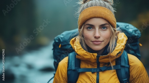 portrait of a woman hiking in the forest wear a jacket and backpack