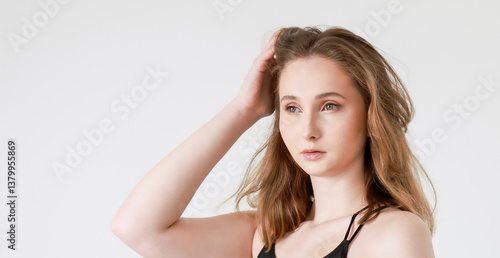 outfit, jean, woman, portrait, beauty, fashion, style, girl, modern, model, stylish, elegant, white, contemporary, pretty, studio, textile, cotton, top, t-shirt, sexy, white background, coiffure, wind, posing, make-up, naked, depilation, foundation, tenderness, minimalist, attractive, fashionable, hair, youth, simplicity, feminine, clothing, woman, dancer, cute, tank top, presenting, looking, grid