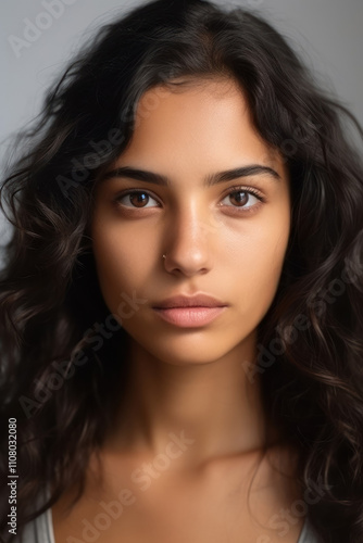 Portrait of a woman of Hispanic ethnicity with bright features, radiant smile and stylish clothes in the background.