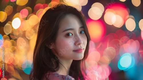 woman, portrait, bokeh, colourful, light, dreamy, high-coloured, hue, photo, bright, serene, female, young adult, beautiful, soft focus, glowing, aglow, many-coloured, defocused, illuminated, atmosphere, aethereal, closeup, head shot, calm, elegant, stylish, shimmering, artistic, glamourous, fashion, contemplative, airy, beauty, pensive, daylight