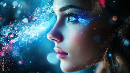 woman, portrait, cosmic, effect, vibrant, colours, galaxy, surreal, artistic, bold, trendy, aesthetic, radiant, striking, unique, contemporary, sleek, polished, dreamy, fluid, high-coloured, edgy, innovative, captivating, colourful, minimal, modern, inspiring, aglow, atmospheric, celestial, concept, professional, imaginative
