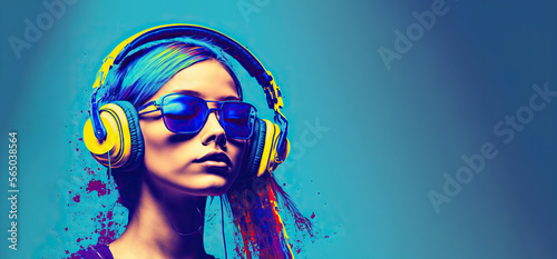 portrait of a woman with headphones on a blue background (AI generative)