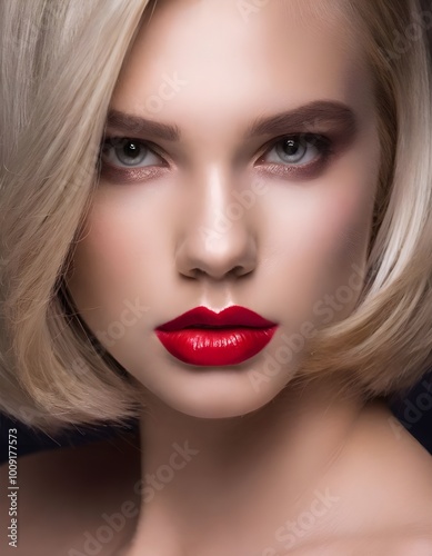 woman, beauty, face, fashion, hair, make-up, lip, model, glamour, eye, make-up, skin, red, closeup, blond, lipstick, style, closeup, studio, elegance, cosmetic, eye, coiffure, person, lady