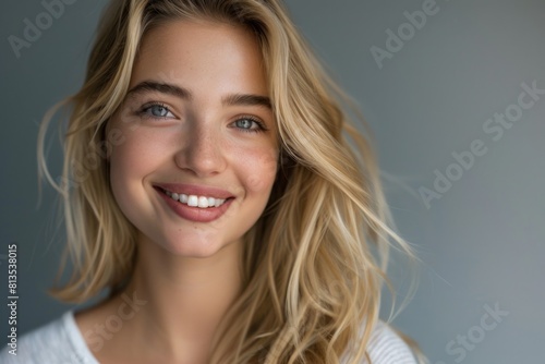 Portrait of a woman with long blonde hair smiling at the camera. Suitable for various concepts