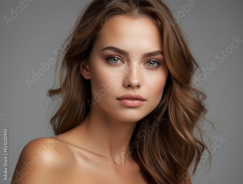 woman, female, portrait, face, eye, green, brown, hair, long, wavy, make-up, skin, naked, lip, pink, shoulder, neck, model, beauty, natural, light, shadow, studio, background, grey, simple, elegant, confident, attractive, gorgeous, beautiful, expression, glance, gaze, look