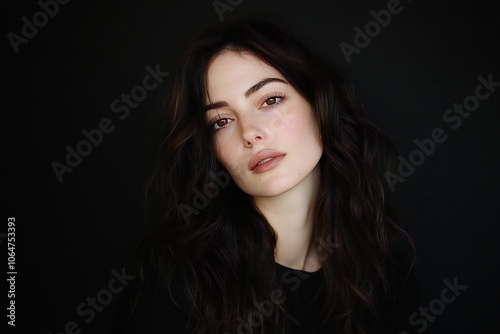 Portrait of a woman with voluminous, wavy brunette hair and a subtle makeup look, placed against a black background
