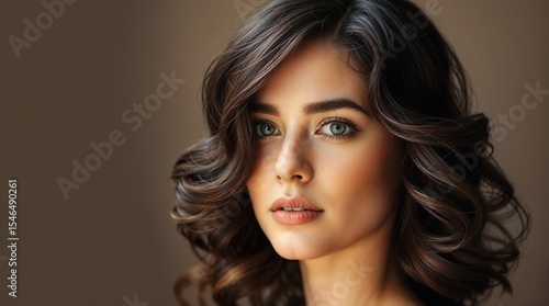 Portrait of a woman with voluminous, wavy brunette hair and a subtle makeup look placed against a neutral background