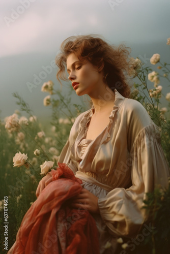 portrait of a woman/model/book character surrounded by flowers in daylight with a thoughtful expression in a fashion/beauty editorial magazine style film photography look - generative ai art