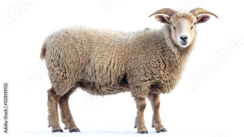 sheep, animal, farm animal, farm, wool, fluffy, horn, curved, nature, portrait, white, background, isolated, domestic, rural, agriculture, fleece, mammal, fur, textured, standing, cute, woolly, brown, hoof, pasture, natural, wildlife, farmyard