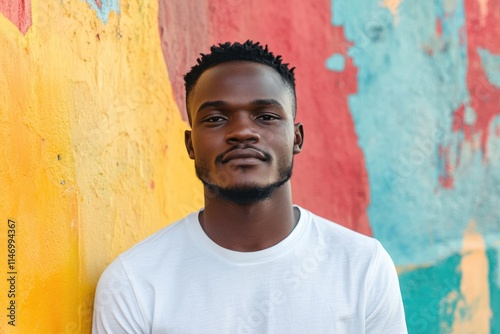 Portrait of a young african man dressed in white t shirt standing on the colorful background