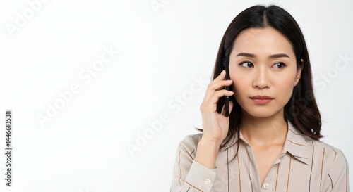 woman, asian, phone, smartphone, mobile, communication, portrait, serious, expression, face, call, talking, business, professional, person, young, adult, isolated, white background, collar, shirt, stripes, neutral, looking, away, hand, ear, technology, device, corporate, office, modern, lifestyle, elegant, confident, closeup, female, brunette, hair, model